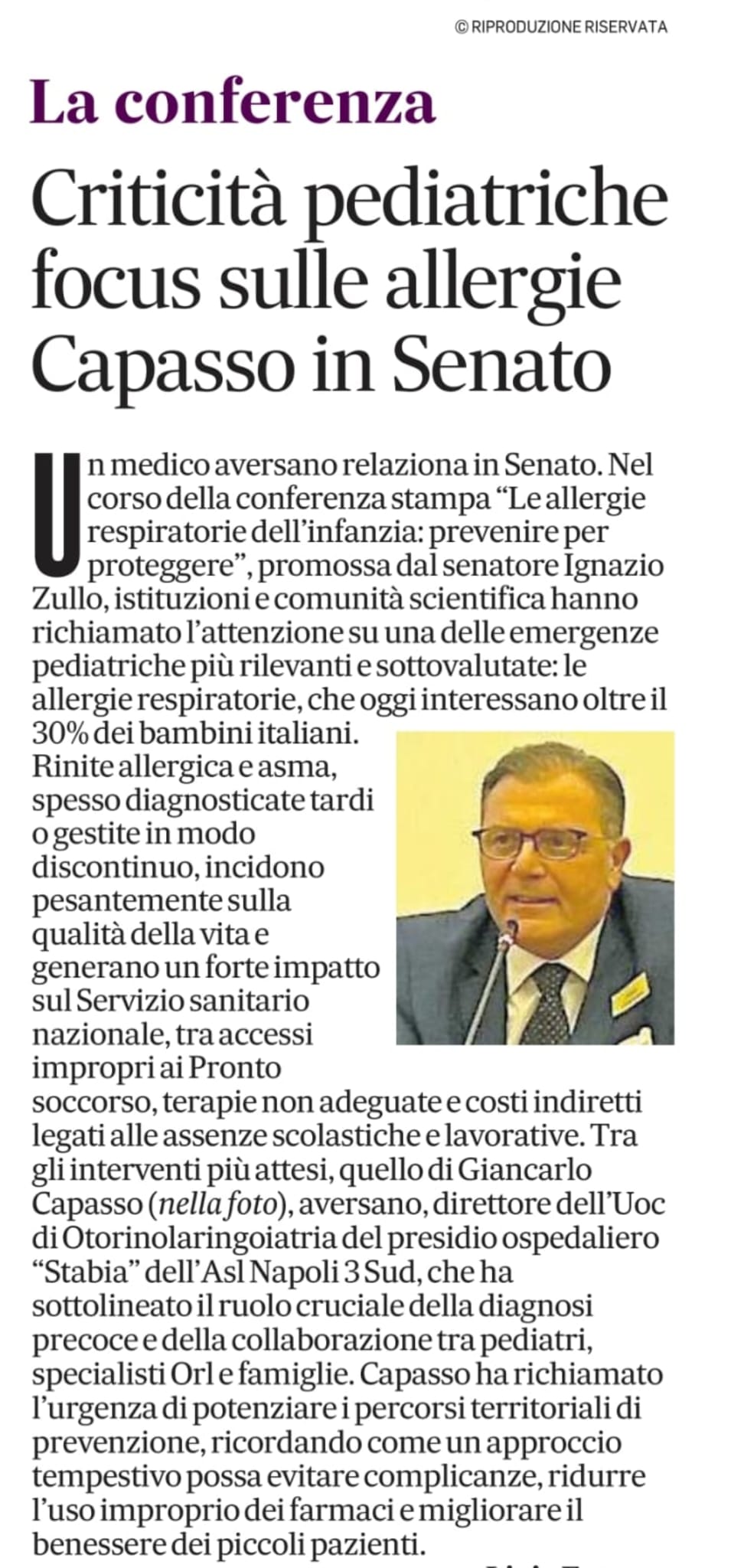 Criticità pediatriche focus sulle allergie: il Dottor.Capasso in Senato
